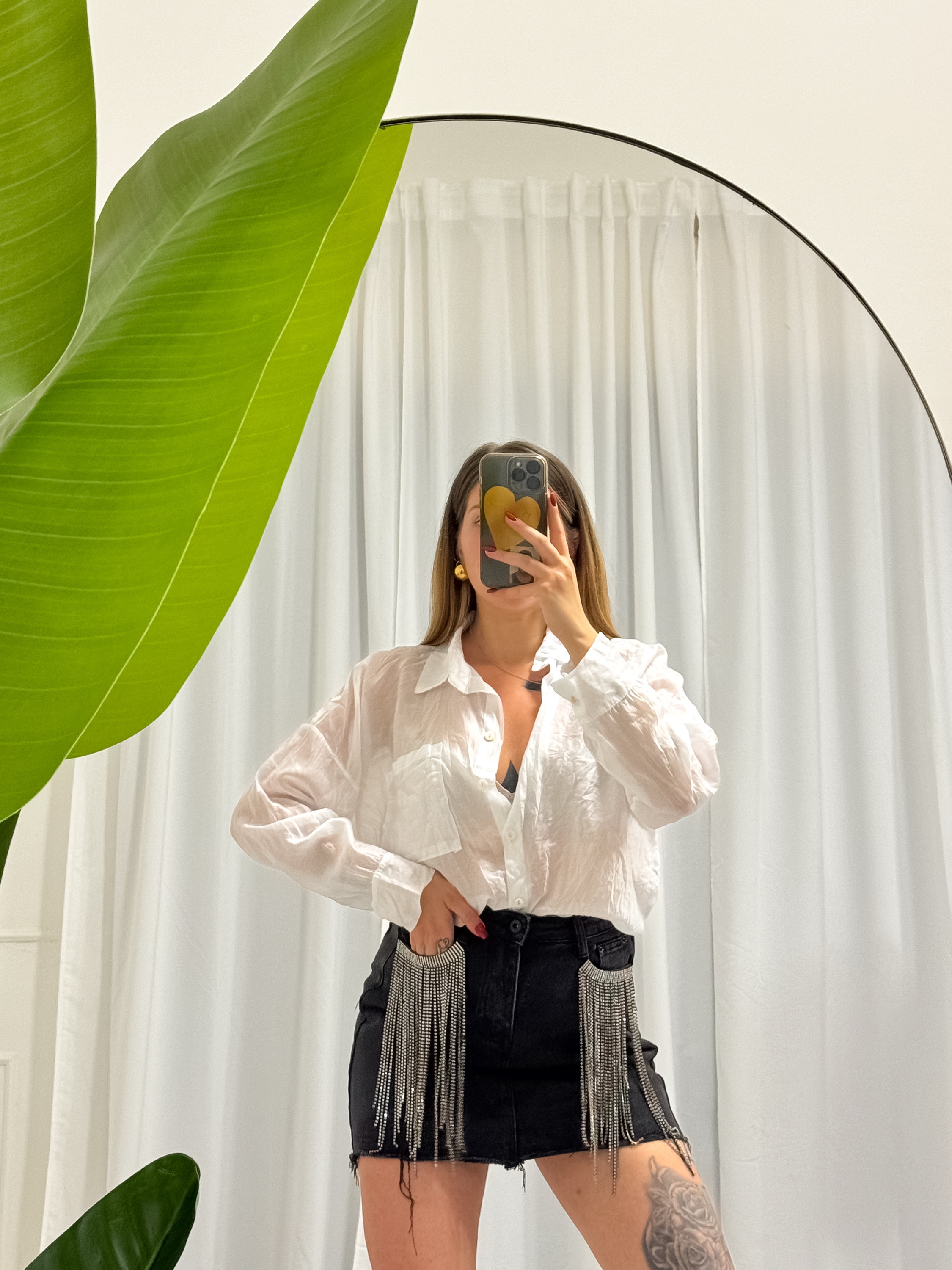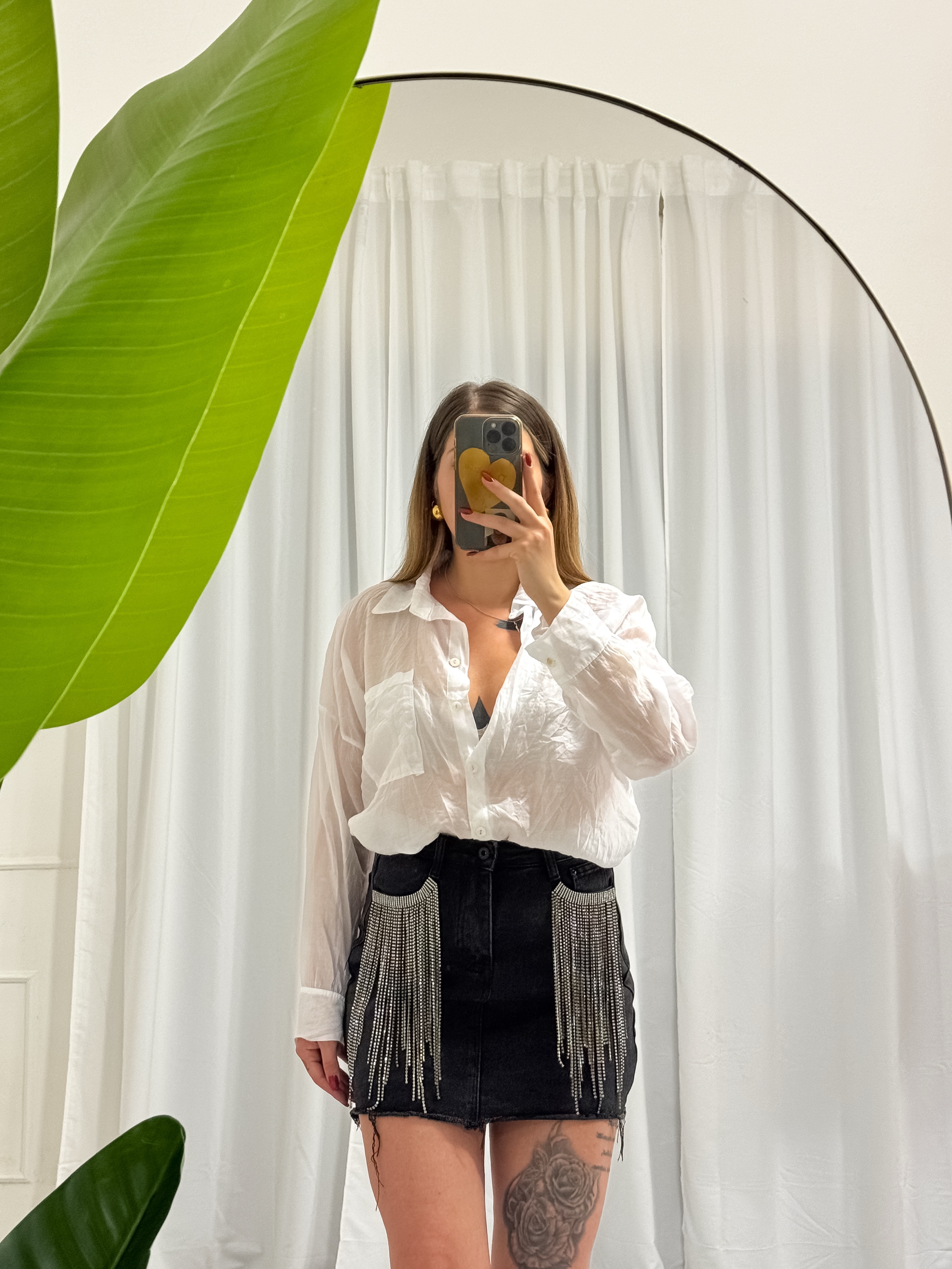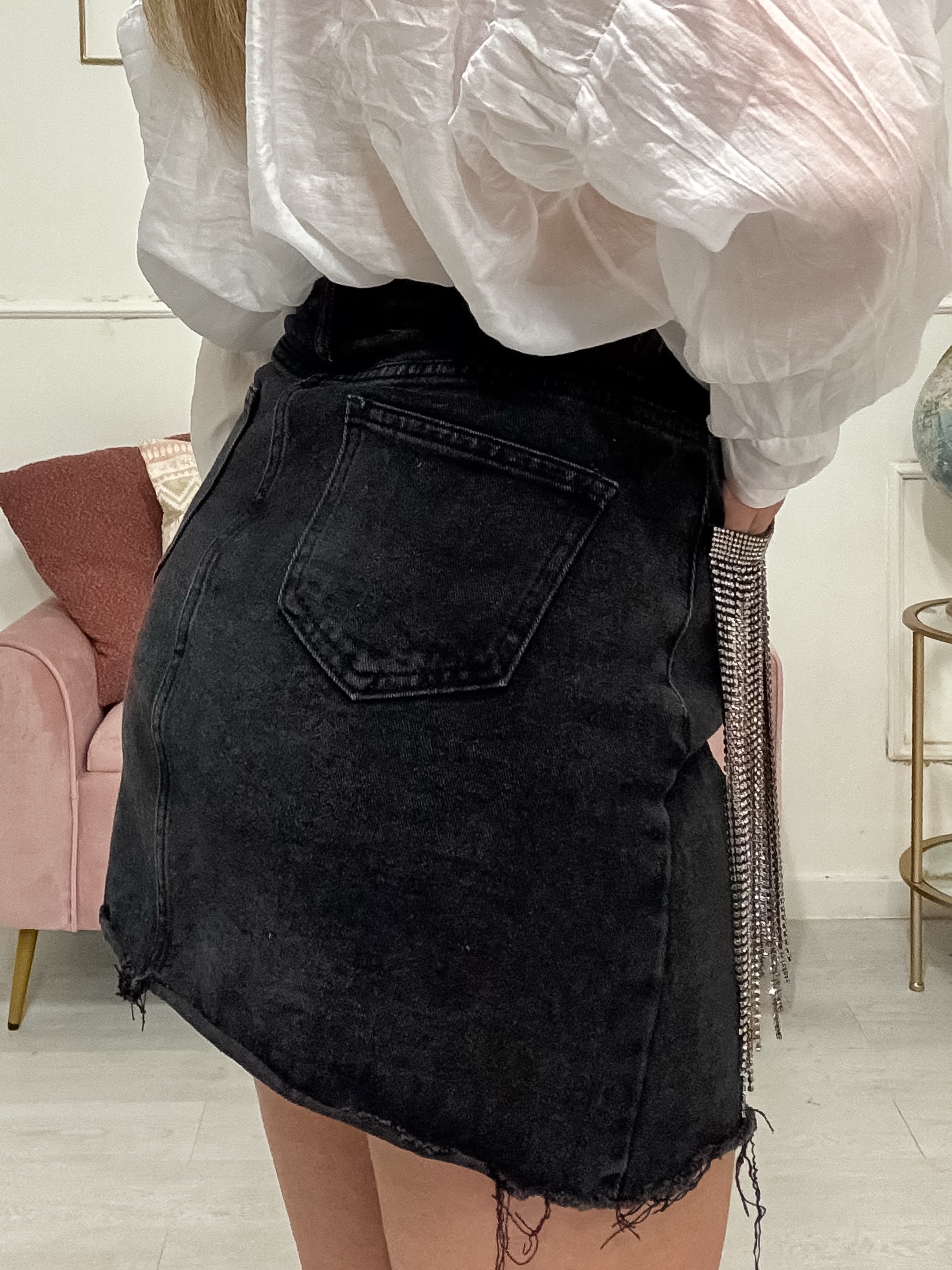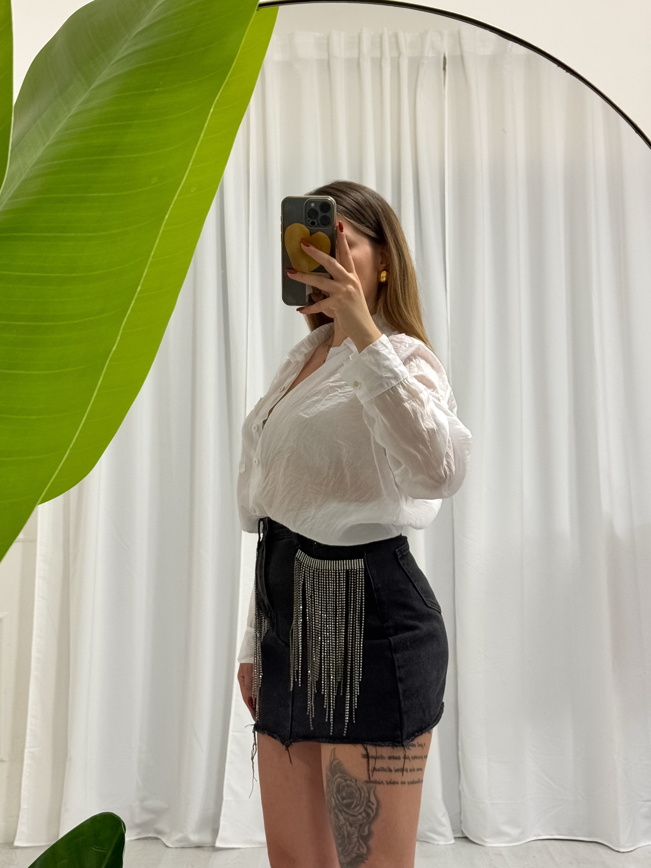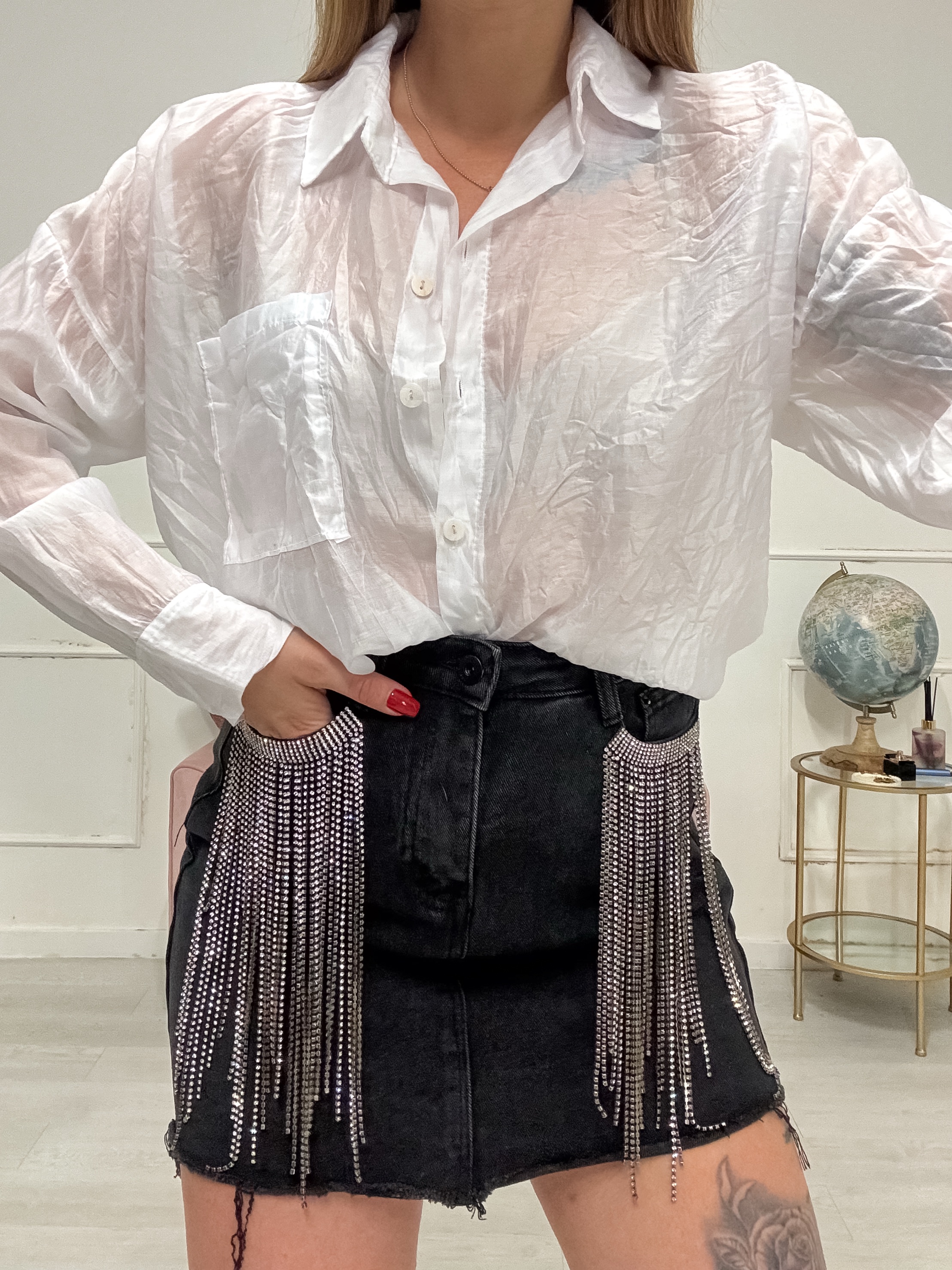 Gonna in denim – frange brillantinati – 5 tasche – leggermente elasticizzata – vestibilitร regolare- consiglio la taglia che s’indossa solitamente
