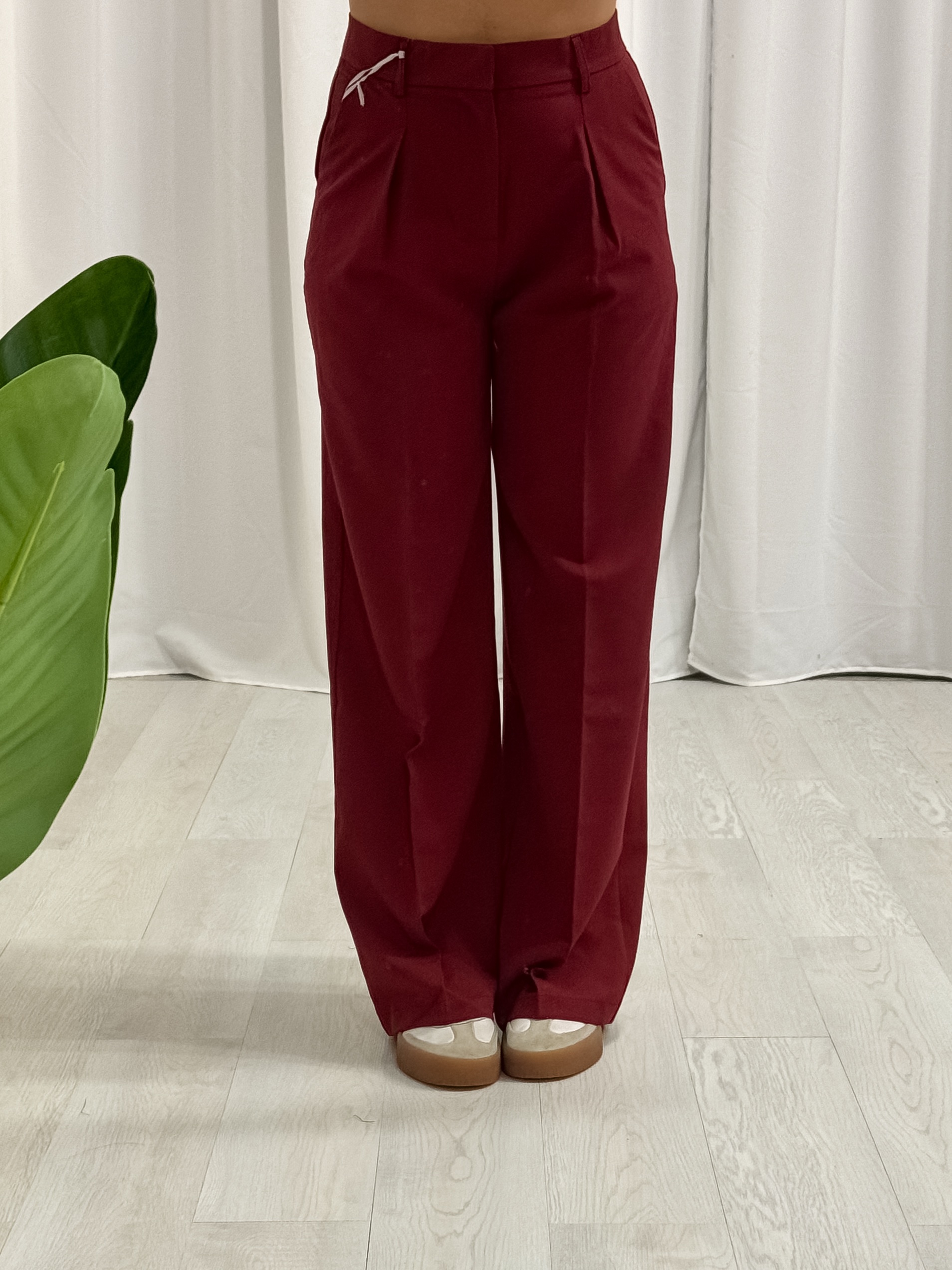 Pantalone classico – a palazzo – pinces ai lati – chiusura con gancetto a scomparsa e zip – 2 tasche – vestibilitร regolare – indosso taglia M