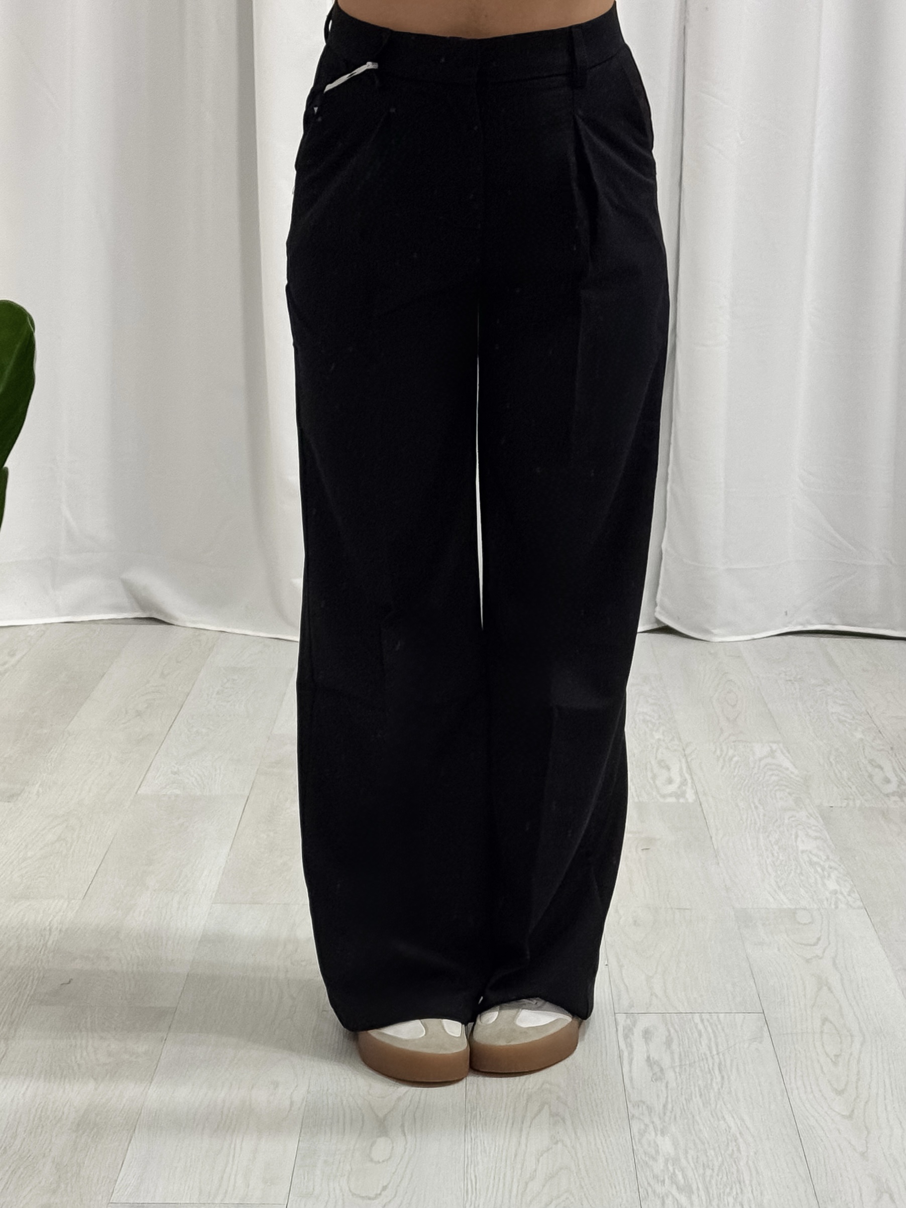 Pantalone classico – a palazzo – pinces ai lati – chiusura con gancetto a scomparsa e zip – 2 tasche – vestibilitร regolare – indosso taglia M