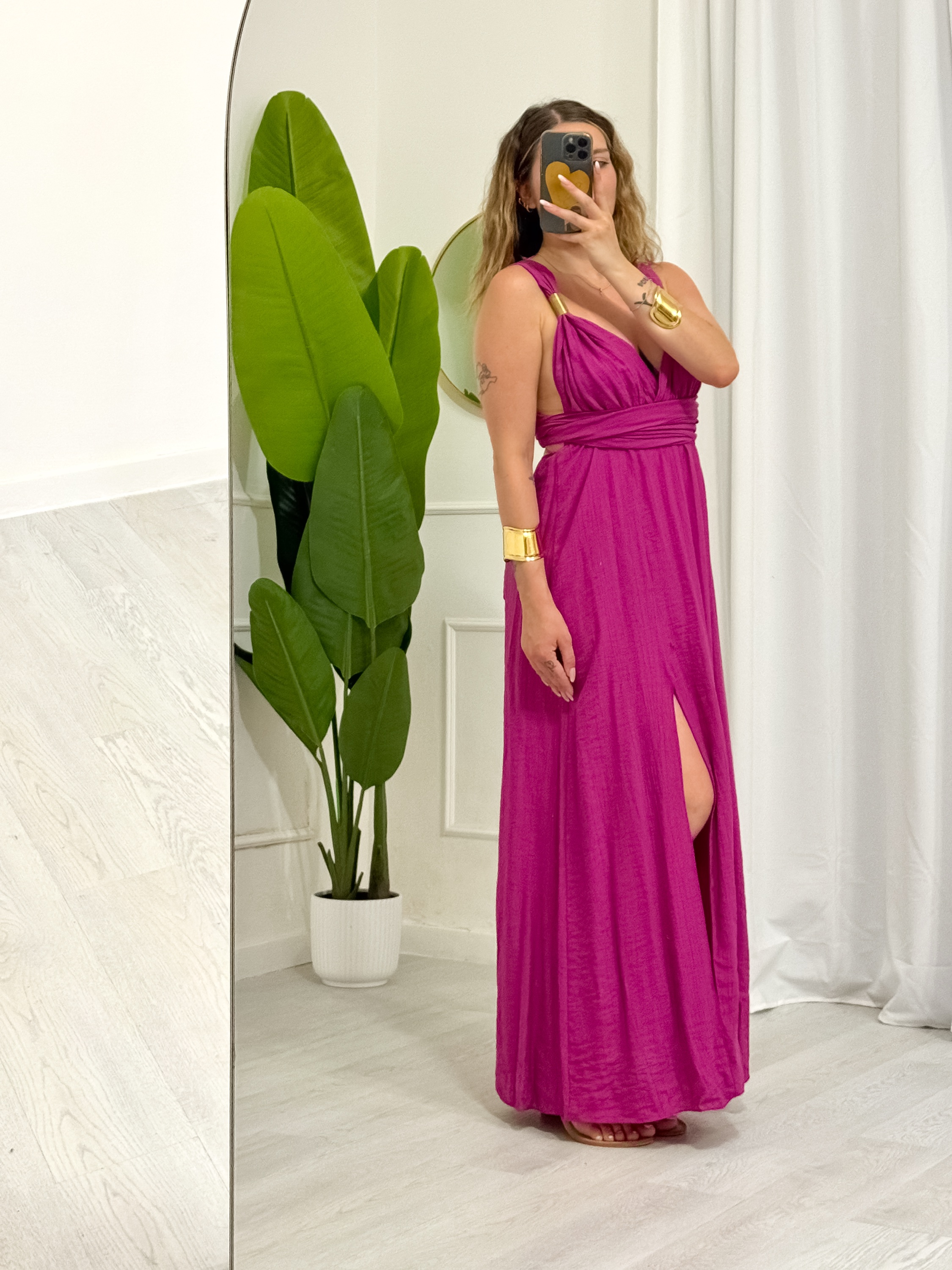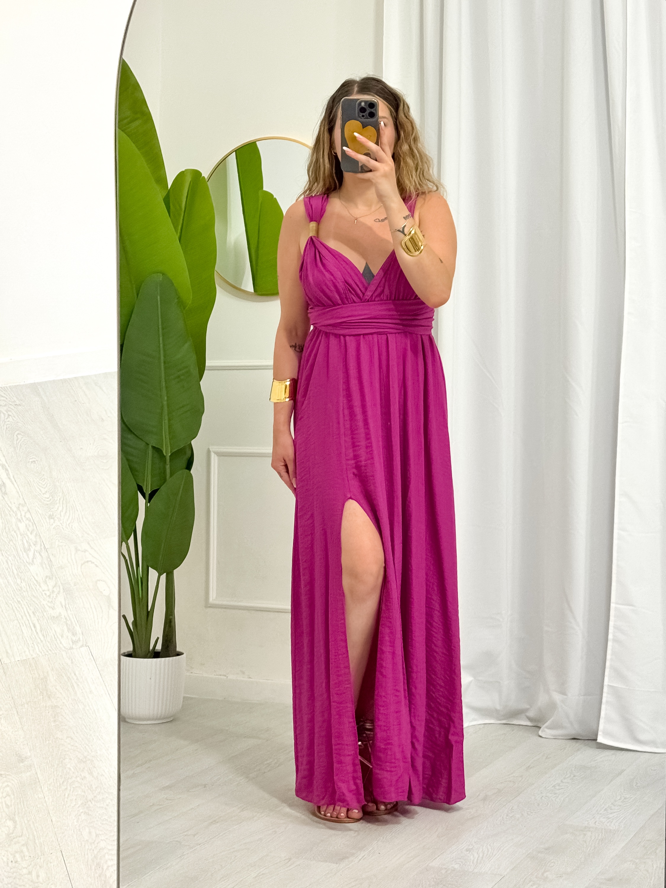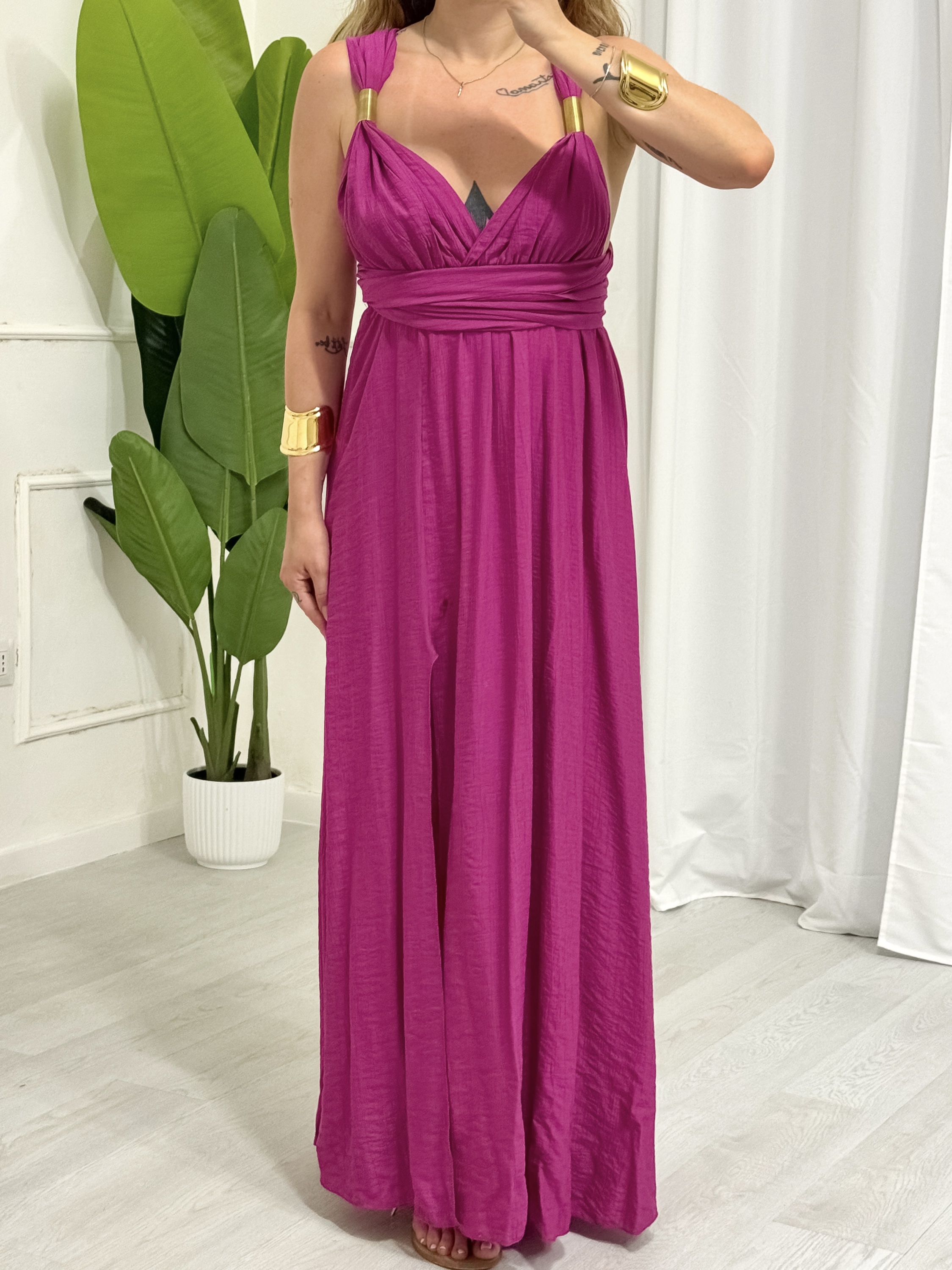 Abito lungo – dettaglio oro sul davanti – spacco laterale – chiusura regolabile